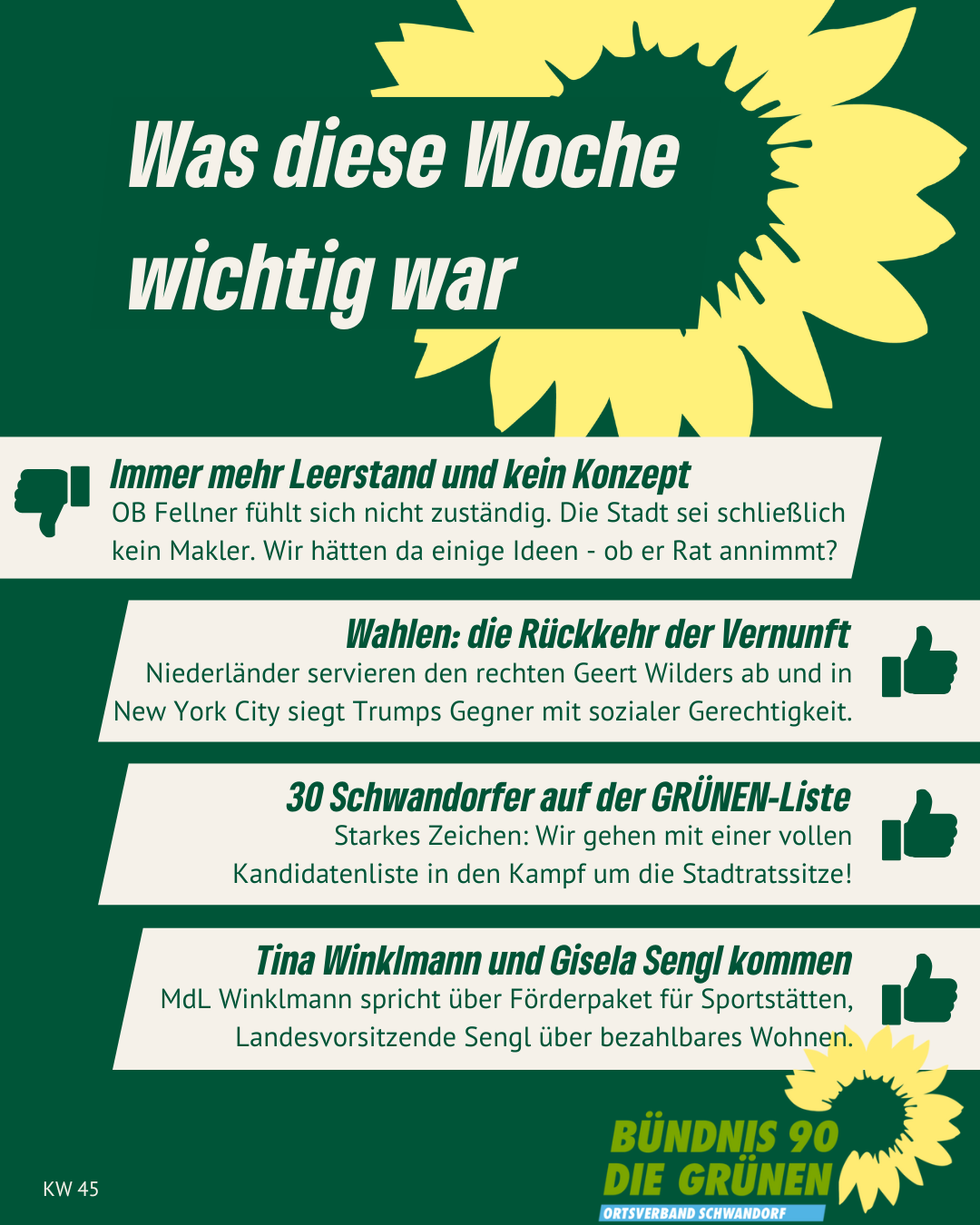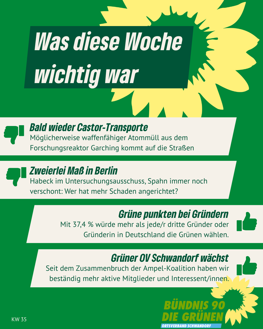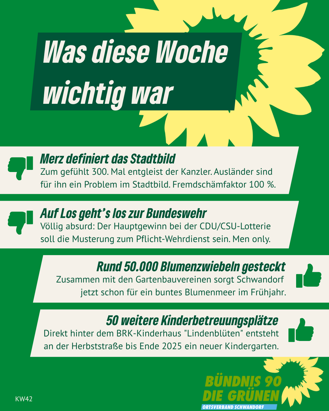 Alle Links auf unserer Homepage, die auf externe Websites leiten, sind mit ↗ gekennzeichnet. Von den Inhalten verlinkter externer Websites distanzieren wir uns ausdrücklich. Diese stehen in keinem Zusammenhang mit unserer Homepage gruene-schwandorf.de.